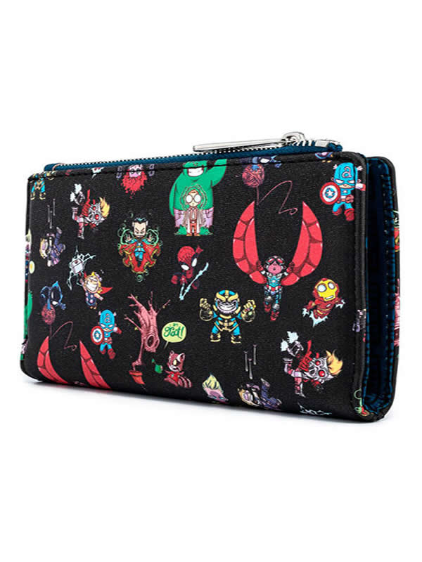 comprar regalos originales en disfracesmimo nunca a sido tan fácil comó esta cartera original de personajes marvel loungefly negra, es perfecta para los más frikis del mercado.