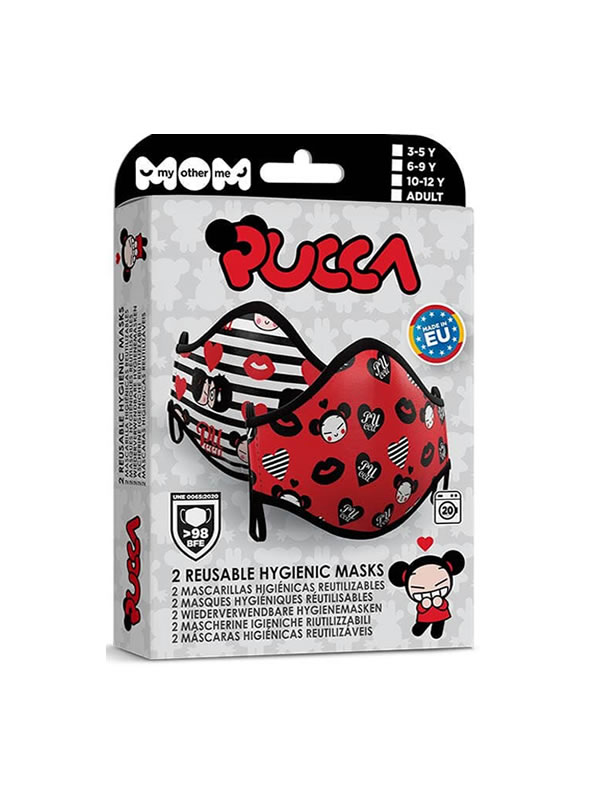 mascarilla higienica de pucca pack de 2. Estas mascarillas higiénicas reutilizables están hechas en la UE y con una eficacia de filtración bacteriana 98% (BFE). Fabricadas según la especificación UNE 0065:2020. La mascarilla higiénica protectora aguanta hasta 20 lavados. Elige entre las tallas de adulto y infantil sal a la calle protegido con lo mejores diseños para hombre, mujer y niño, niña.