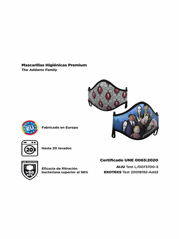 mascarilla reutilizable family addams. Este pack incluye dos mascarillas con dos diseños diferentes y súper originales. Estas mascarillas higiénicas reutilizables están hechas en la UE y con una eficacia de filtración bacteriana 98% (BFE). Fabricadas según la especificación UNE 0065:2020. La mascarilla higiénica protectora aguanta hasta 20 lavados. Elige entre las tallas niño o niña, infantil, adulto.